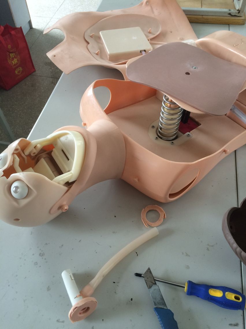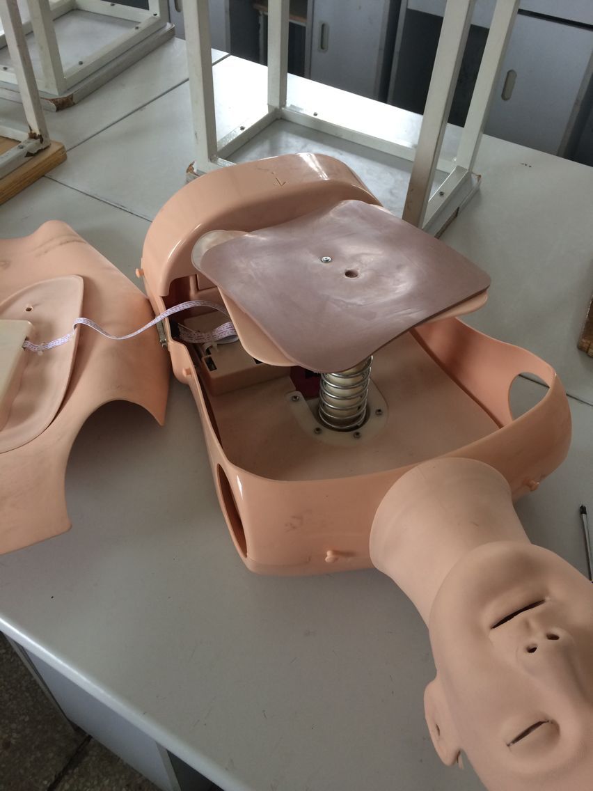 1、打開胸部,卸下中間螺絲,將心肺復蘇模型下面黑色傳感器用手按壓一下,查看有沒有彈性,若沒有