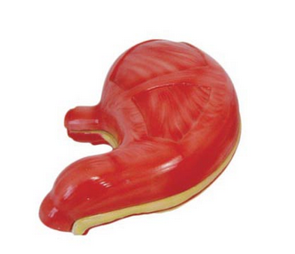 胃解剖模型作縱剖,顯示胃在中等度膨脹時的形狀,顯示:粘膜壁、幽門瓣、幽門括約肌、胃粘膜以及由食管向胃移行之粘膜等構造。