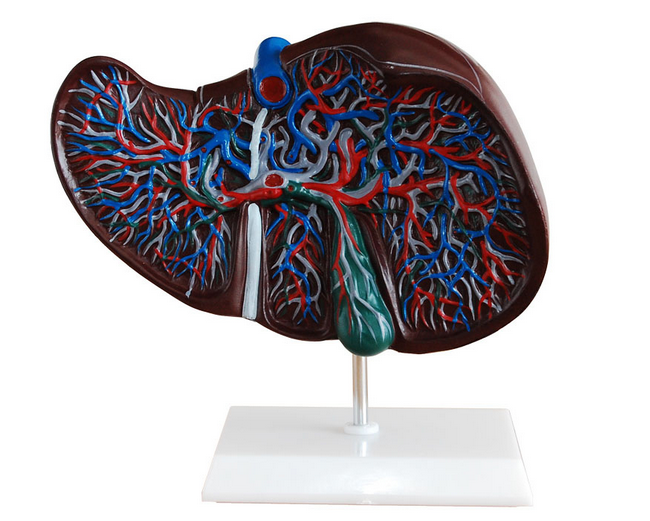 這款模型以不同顏色表示肝臟內(nèi)完整的血管網(wǎng):門血管,肝內(nèi)肝外膽管,置于底座上。