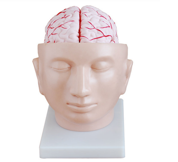 這款模型顯示顱內(nèi)的腦結(jié)構(gòu),顱基之上頭部可平行打開。腦模型可中分以顯示腦動脈和可拆卸腦底動脈。兩半都可分解為: 前頂葉、顳枕葉、腦干、小腦置于基架上。