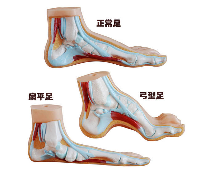 本模型顯示了正常足、扁平足、弓形足的解剖結(jié)構(gòu)及其脛骨末端的特征。